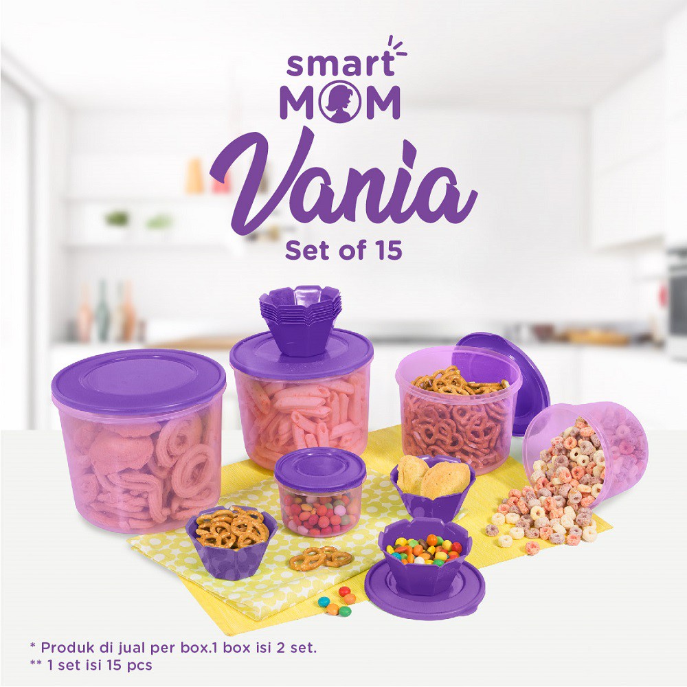 Smart Mom Vania Set of 15 pcsSmart Mom Vania Set of 15 pcs, koleksi tempat penyimpanan dan penyajian makanan yang multifungsi dan praktis, cocok menemani momen kebersamaan yang menyenangkan. Set tempat penyimpanan snack atau makanan lainnya dengan warna ungu favorit dan packing yang praktis.Seri Smart Mom pertama yang menghadirkan toples dengan ukuran hingga 3.250 ml.Wadah penyimpanan dilengkapi dengan mangkuk saji dengan bentuk mungil dan cantik. Hadir dengan warna ungu favorit moms se-Indonesia.Keunggulan produk ini :- Ukuran storage yang beragam untuk berbagai makanan atau kebutuhan, mulai dari 3.250 ml- Material plastik PP5, Food Grade dan BPA Free (Aman untuk makanan dan minuman)- Air tight atau kedap udara, snack tetap renyah - Warna ungu favorit- Wadah snack yang memudahkan saat memakan, jadi tangan tidak kotor. PRAKTIS!!Smart Mom Vania Set of 15 pcs terdiri dari :- 1 storage uk. 3250 ML- 1 storage uk. 2250 ML- 1 storage uk. 1500 ML- 1 storage uk. 800 ML- 1 storage uk. 350 ML- 10 Pcs Mangkuk Snack kecil, ukuran 190 ml (bisa jadi cetakan puding atau agar2 juga loh)Harga yang tertera adalah harga per box. 1 box isi 2 set.1 set isi 15 pcs.Harga SRP / set 99.000Berat Produk- Berat Volume : 2.07 kg#vania #toplessnack #toples