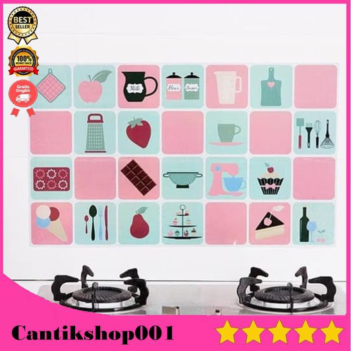 READY MOTIF :catTembok dapur yang suka berminyak sering bikin kesal, yang namanya minyak pasti susah dilap dan dibersihkan. Akibatnya tembok dapur jadi kelihatan kotor dan jelek.Gak perlu khawatir, solusinya dengan stiker dapur anti minyak. Stiker yang didesign khusus untuk dapur, dari bahan anti minyak sehingga mudah dilap dan dibersihkan.fituruntuk melindungi dinding karena suhu tinggi, minyak, air, menempel di dinding yang mengelilingi kompor,Keluarkan kertas pelindung di bagian belakang, bisa langsung menempel ke dindingrUkuran stiker 45 x 70 cm, jika ingin terpasang panjang maka anda harus beli beberapa sticker untuk disambung. Stiker bisa ditempel di permukaan tembok yang keramik maupun yang tanpa keramikCara Pasang :- Lap bersih permukaan yang hendak ditempel, jangan berdebu atau berminyak- Lalu keringkan permukaan yang hendak ditempel- Cabut kertas yang nempel di stiker. cabutnya sambil ditempel, maksudnya jangan cabut sekaligus supaya nempelnya bisa rata- Agar saat pemasangan tidak miring, sebaiknya tembok dikasi sedikit tanda dulu dengan pensil atau pul