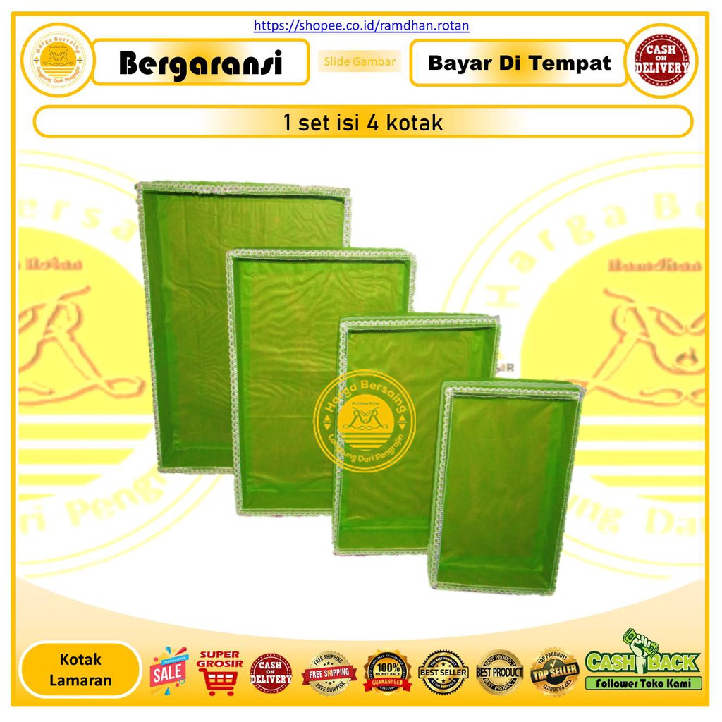 Cukup jadi follower atau ikuti toko kami, bisa dapat voucher diskon belanja harga promo dan update produk terbaru dari toko kami.Wajib Baca Deskripsi, Biar Gak Salah PahamHarga Tertera Untuk 1 Set Isi 4 pcs (kotak). tidak bisa request ukuran, dan tanpa plastik mikaKotak 1 : P.29cm x L.19cm x T.4cm, Kotak 2 : P.33cm x L.23cm x T.5cmKotak 3 : P.37cm x L.27cm x T.6cm, Kotak 4 : P.42cm x L.31cm x T.7cmBahan Dasar Kardus dihiasi pernak pernik.Tersedia Warna : hijau, ungu, merah, pink, biru, orangeRequest Warna, Tulis di kolom keterangan atau konfirmasi setelah check out order, Tidak ada request, maka di kirim random.Jika warna yang di reques kosong, kami akan konfirmasi terlebih dahulu, 8 jam tidak ada tanggapan, akan di kirim secara random.Request Warna Tidak Berlaku untuk variant Warna Random.Pilih Variant Sesuai KebutuhanKlik barang : klik beli : pilih variant : lanjutkan ke pembayaranVariant Produk :Warna Random : Warna stok yang adaRequest Warna : Warna Bisa RequestPacking Biasa : Packing hanya menggunakan plastik biasaPacking Bubble Wrap : Packing menggunakan Bubble WrapPacking Kardus : Packing menggunakan kardusPacking Kardus : Packing menggunakan kardus dan bubble wrapBubble wrap adalah sejenis plastik bergelembungKerusakan barang pada saat pengantaran kurir, di luar pantauan kamiCATATAN :1. Rekam Pada saat membuka paket2. Prioritas Kiriman Untuk Yang Lebih Dahulu Memesan3. Jika Ingin Memb@t4Lkan Transaksi, Silahkan Hubungi CS SHOPEE (bukan dari pihak penjual)4. Keterlambatan Pengantaran Barang Oleh expedisi Di Luar Wewenang Kami, Kami Hanya Bisa Bantu Follow UpProsedur R3tur ?? 1. klaim r3tur tidak berlaku jika tidak memberikan bukti vidio rekaman pada saat membuka paket serta memberikan photo jelas barang disertai label alamat dan resi yang menempel pada paket2. Pergantian On9kos Kirim Peng3mbalian, Berdasarkan Berat Yang Sama Pada Resi Pengiriman Kami (tidak lebih).3. Tidak menerima kompl@in setelah dana remit ke kamiSegera konfirmasi terima pesanan, jika barang sudah sampaiMohon Maaf Jika Ada Kekurangan Dalam PelayananHarga Bersaing !! Langsung Dari PengrajinSelamat BerbelanjaTerima