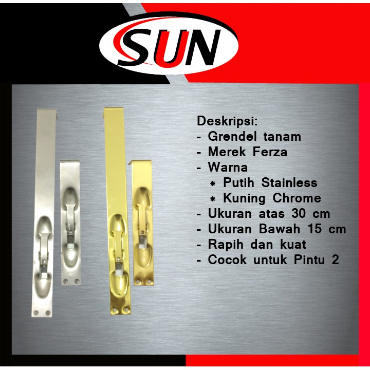Deskripsi :- Grendel Selot Tanam- Merek Ferza- ukuran Atas 30 cm- ukuran Bawah 15 cm- Warna Gold chrome atau Putih Stainless ( harap Mencatumkan Warna Yang Di inginkan Ataua kami kirim sesuai Stok )- Rapih dan Kuat- Cocok untuk Pintu 2 / Pintu utama----------------------------------------------------------------------------------------------Grendel selot tanam ferza memilki kualitas finishing produk yang baik dan produk yang tebal cocok untuk pintu utama mapun pintu yang memilki 2 daun pintu.Salam,Sun har