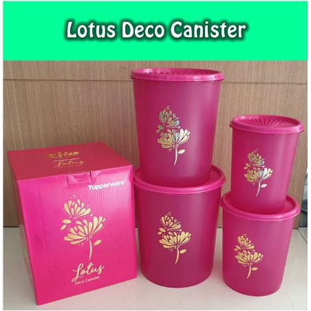 Lotus Deco canister SetUkuran:Terdiri dari :a.Large Deco Canister (1) 3.5 L // d: 19 cm, t: 21.5 cmb.Medium Deco Canister (1)2.8 L // d: 17 cm, t: 19 cmc.Small Deco Canister (2)1.9 L // d: 14.8 cm, t: 17.4 cm1.2 L // d: 12.8 cm, t: 15.5 cm Wadah penyimpanan seharusnya tidak hanya sekedar tempat menyimpan makanan yang ada di dalamnya, melainkan juga harus berfungsi menjaga kualitas makanan. Tupperware menghadirkan Lotus Deco canister Set untuk menunjang kebutuhan penyimpanan makanan dengan tampilan wadah cantik dan modern, dibawa kemana pun jadi lebih praktis!Deco Canister Set ini memiliki seal jenis ’Classic Round Seal’ yang rapat menahan udara masuk dan keluar dari wadah, sehingga makanan yang disimpannya dapat renyah lebih lama. Selain itu bagian transparan pada base, memudahkan melihat isi di dalamnya.Berikut keistimewaan lain dari Lotus Deco canister:1.Basenya transparan sehingga mudah untuk mengecek isinya.2.Bagian luar pada Base memiliki tekstur kasar sehingga tidak mudah tergores. Sedangkan pada bagian dalamnya licin sehingga mudah dibersihkan.3.Mudah untuk dibawa dan membuka 4.Memiliki seal jenis Classic Round Seal yang membuat snack lebih tahan lama5.Agar lebih istimewa saat bersantai, Anda bisa menyimpan snack berukuran besar di Lotus Deco canisterSet dan snack berukuran kecil di Mini Deco Canister (4)NB: MOHON TANYAKAN KETERSEDIAAN BARANG TERLEBIH DAHUL