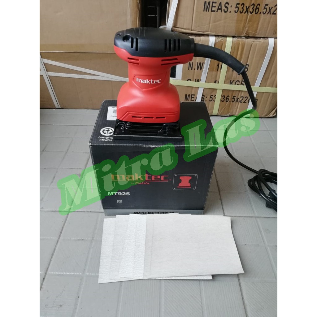 Maktec MT925 / MT 925 Mesin Amplas - Light and Easy Palm SanderSpesifikasi :Continuous rating Input: 180 WPad size: 112 x 102mmAbrasive paper size: 114 x 140mmOrbits per minute (opm): 14,000 opmSanding per stroke (spm): 28,000 spmDimensions (L x W x H): 110 x 112 x 133mmKualitas M