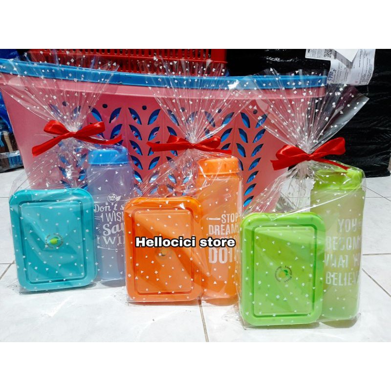 parcel kemasan ultah 1 pcs lunch box lemony 1 pcs my botle 1pcs plastik kemasan 1pcs pita kemasan mohon dibaca baik" warna tidak boleh milih karna stok dan warna sesuai dai pabriknyajadi kami kiirm ra