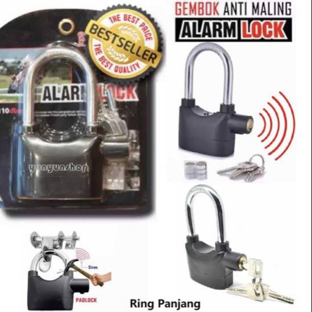 Termurah - Gembok Alarm Anti MalingKami menjual Gembok Alarm Lock Kunci Pengaman Rumah Pagar Sepeda Dll.Gembok Alarm gembok yang berfungsi sebagai Lock atau pengunci mempunyai kekuatan setara dengan alarm mobil, jadi sangat cocok untuk keamanan motor, pintu pagar, gudang/toko dll.Kinbar Gembok Alarm Lock memiliki fitur sbb:- Sistem Alarm akan aktif jika terkena getaran atau pukulan- Kekuatan Suara sistem alarm 110dba, setara dengan bunyi alarm mobil- Anak kunci tidak dapat diduplikasi- Alarm otomatis akan berhenti setelah 35 detik dlm posisi tidak kena getaran.- Baterai lock dari dalam dan tidak bisa dibuka saat gembok terkunci- Umur Baterai bisa bertahan sampai 2 tahun.Warna hitam