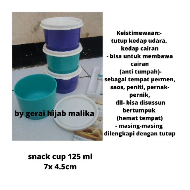 Produk ini terdiri dari sangat cocok untuk menyimpan aneka bumbu dan snack dengan mudah. Dengan desain dan warna yang cerah dan cantik segera lengkapi koleksi produk special ini berlaku di Promo Tupperware Desember 2016. Dilengkapi dengan seal /tutup yang ketat dan rapat serta terdapat tab di salah satu sisi seal agar si Kecil mudah membukanya.tersedia warna biru toska /ungu #sna