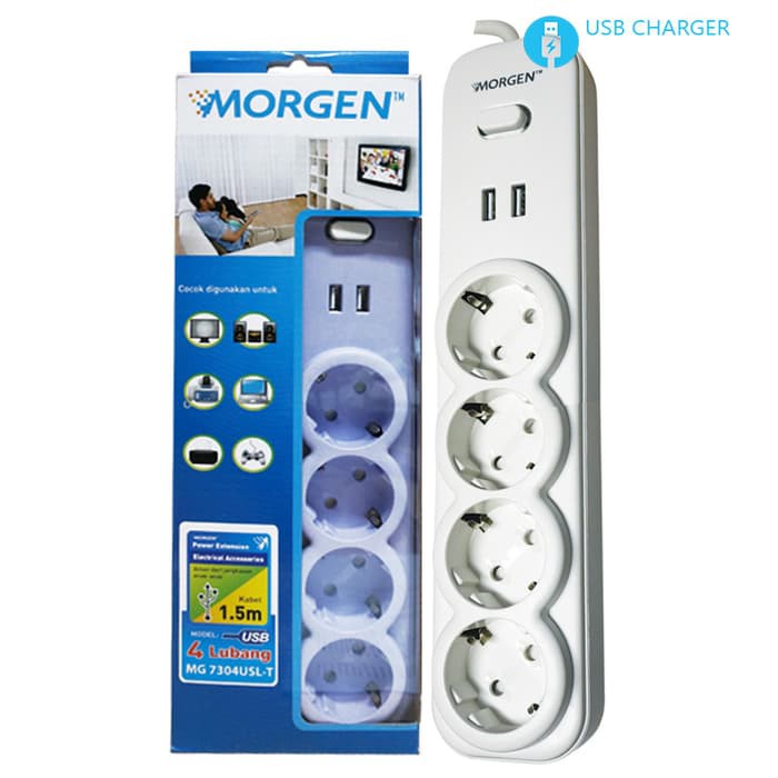 Stop kontak Merk MORGEN 4 lobang Model MG 7304USL-TPanjang kabel : 1.5 meter ( Tembaga Murni )2 Port USB : 2.1APenutup otomatis di tiap lubang socket + terbuat dari bahan Polycarbonate tahan api.Dilengkapi dengan 1 saklar ON-OFF ( saklar utama )Detail produk dari Morgen Stop Kontak Morgen 4 Lubang + Saklar + kabel 1,5 meter + 2 port USB- Tegangan : 250 V- Daya Listrik : 2500W- Teminal Kuningan- Tersedia 3 warna variant (Putih, Ungu, Biru) : di kirim secara acak ( no komplain )FItur :- Berlisensi SNI , NPB : 111-116-150264- Terminal terbuat dari kuningan sehingga tidak mudah panas.- Dilengkapi dengan penutup otomatis disetiap lubang socket untuk melindungi anak-anak dari resiko sengatan listrik- Terbuat dari bahan Polycarbonate (PC) yang tahan api dan tidak mudah pecah.- Bergaransi 1 tahunProduk terkait STOP KONTAK MORGEN with USB :- Stop kontak 1 lobang di lengkapi 2 port USB handphone 2.1A : - MG7303USL-T Morgen Stop Kontak 3 Lubang + Saklar + kabel 1,5 m + 2 USB : - MG7304USL-T Morgen Stop Kontak 4 Lubang + Saklar + kabel 1,5 m + 2 USB : - MG7303USL-S Morgen Stop Kontak 3 Lubang + 4 Saklar + kabel 1,5m + 2USB : - MG7304USL-S Morgen Stop Kontak 4 Lubang + 5 Saklar + kabel 1,5m + 2USB : barang tersedia boss , langsung dipesan , akan segera kami p