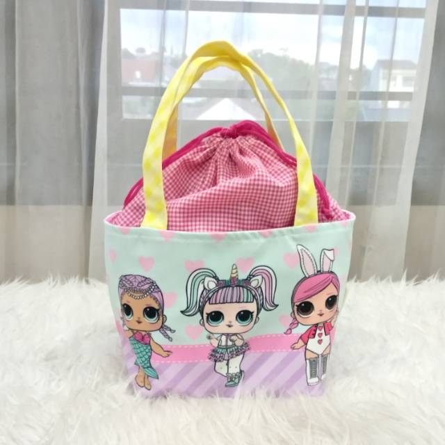 Tas bekal Print LOLBagian dalam ada lapisan waterproofBahan luar: kanvas, bagian serutan : katunGambar bolak balik beda ya.#tasbekal #lunchbag #LOL #tasLOL #LOLbag #kidsbag #tasa