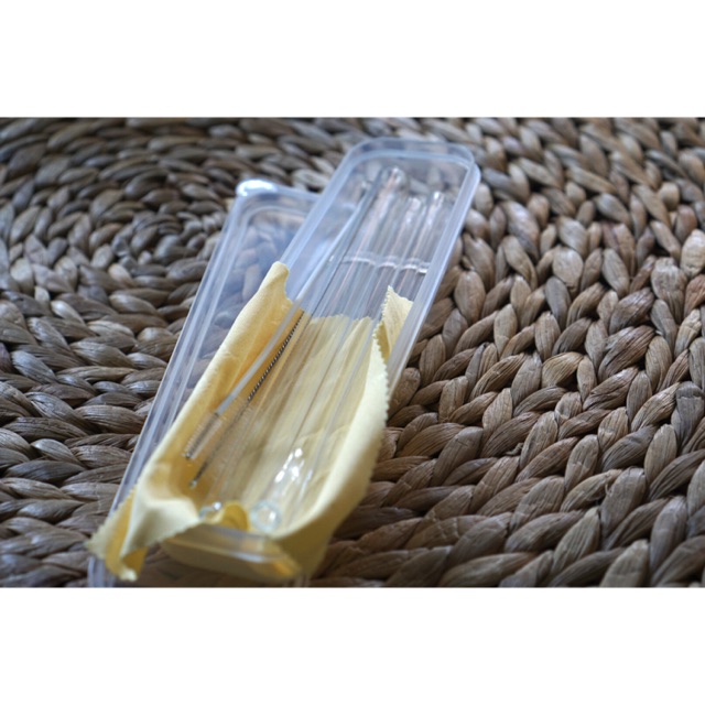 Sedotan gelas satu set:- 3 jenis sedotan- 2 jenis pembersig- 1 lap- tempat kotak plastikBahannya terbuat dr pyrex, aman untuk anak-anak karena ujungnya tidak tajam..Tidak berasa rasa 'aneh' ketika minum menggunakan sedotan gelas dibanding sedotan stainlesa atau kayu.Yakin bersih setelah dipakai karena bagian dalamnya bisa terlihat.. Sedotan bisa pecah- jadi jangan dibanting atau diketuk2kan dengan keras.Silahkan diord